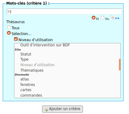 Par exemple, ici la sélection se fait sur le thésaurus « Niveau d’utilisation » : tous les mots-clés de ce thésaurus sauf le mot-clé ayant pour idalpha « 3 » correspondant au mot-clé « 3 - administration » :