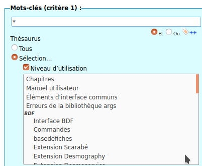 L’exemple ci-dessous fait une sélection sur le thésaurus « niveau d’utilisation », pour toutes les fiches ayant au moins un des mot-clés du thésaurus :