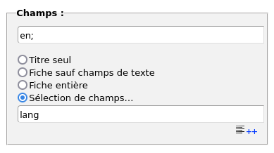 Pour sélectionner des fiches en fonction de leur langues, il faut passer par l’entrée du menu Sélection et, dans la partie « Champs », choisir l’option Sélection de champs… et indiquer lang comme nom de champ.