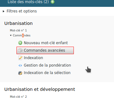 , sélectionnez le thésaurus de mots-clés, ici le thésaurus des mots-clés thématiques,puis dans « Commandes », sous le mot-clé à fusionner, cliquez sur « Commandes avancées »
